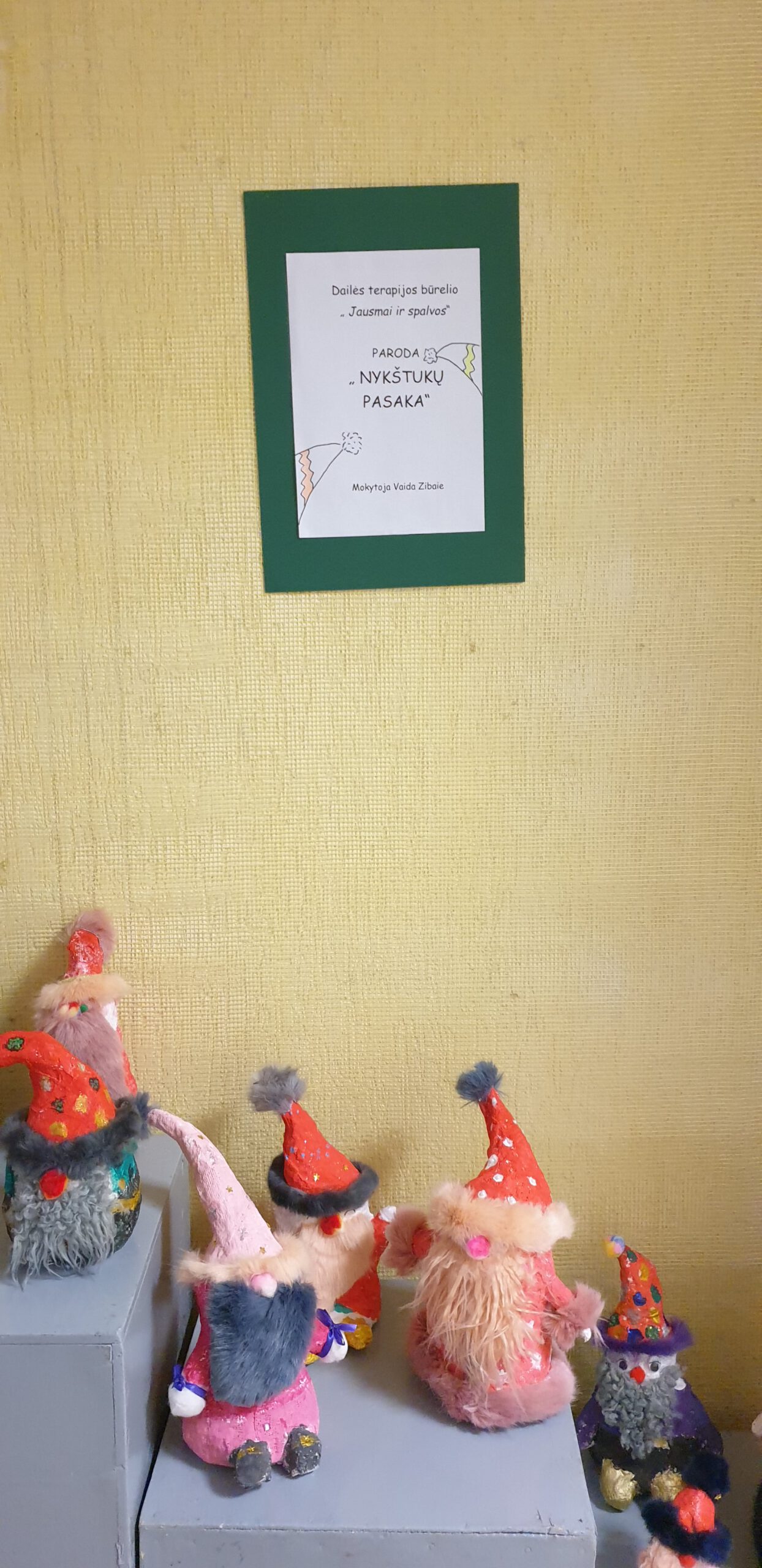 Moksleivių namuose vyksta dailės terapijos būrelio” Jausmai ir spalvos” žaismingų nykštukų, kuriuos vaikai kūrė su šventine nuotaika, paroda. Gipsas, dažai, kailis, tai tik priemonės, kurios buvo panaudotos. Tačiau vaikų kruopštumas, išradingumas, kūrybiškumas suteikė nykštukams išskirtinio žavesio.