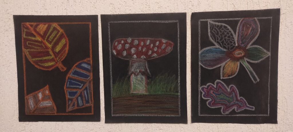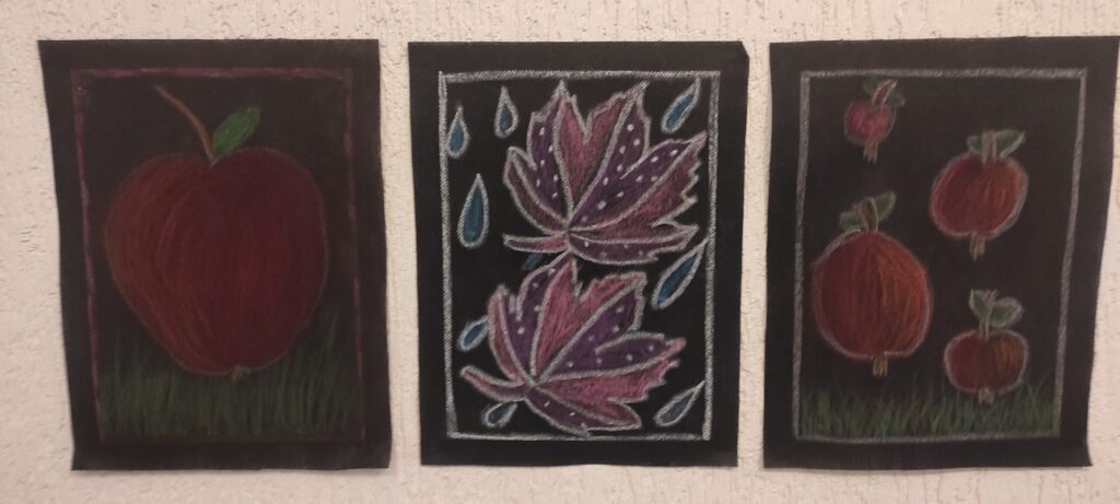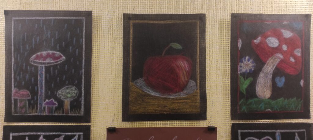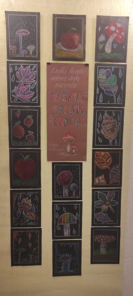 Kai laukais, miškais ir pievomis atkeliauja nuostabus ruduo, o medžių lapai ima geltonuoti, rausti ir ruduoti, taip ir norisi ką nors rudeniško sukurti, nupiešti. Rudens įkvėpti dailės būrelio mokiniai ant juodos agroplėvelės piešė įvairius grybus, raudonskruosčius obuolius, margaspalvius medžių lapus. Jų sukurti darbai eksponuojami Moksleivių namuose, parodoje „Ryškiaspalvis ruduo“.